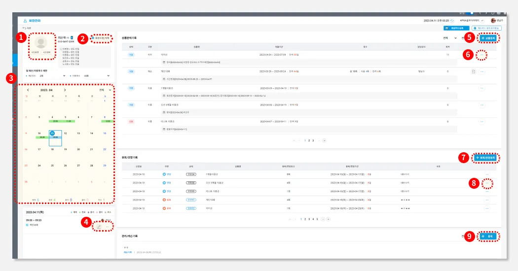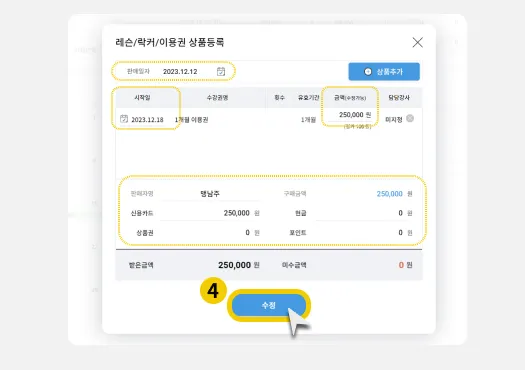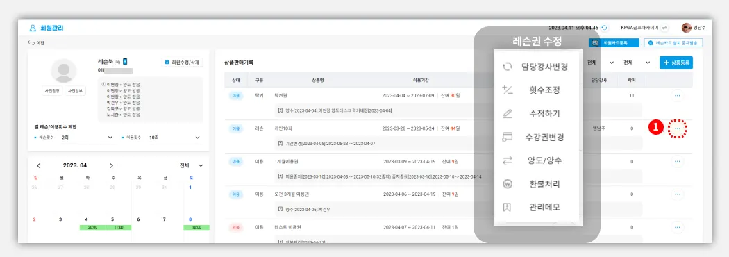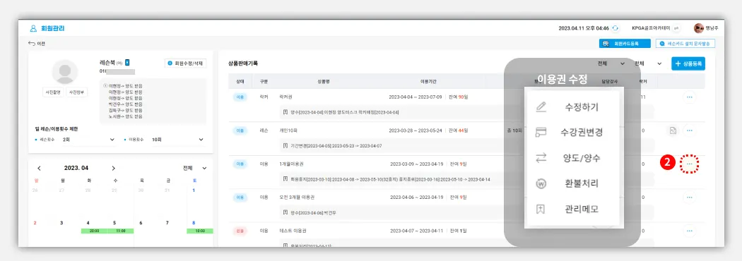회원이 보유한 상품을 수정할 수 있습니다. 기간의 변경, 환불, 횟수조정 등이 가능합니다.