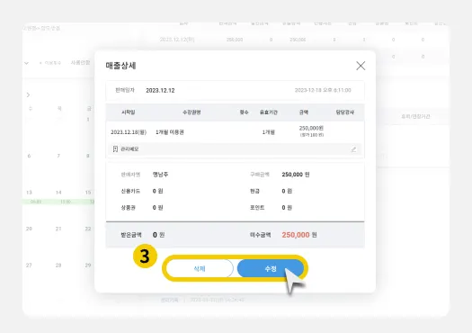 매출 상세 팝업창에서,‘삭제’버튼을 눌러, 해당매출을 삭제할 수 있습니다. 또한 ‘수정’버튼을 눌러 매출등록 페이지를 호출합니다.