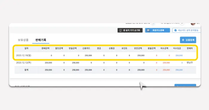 회원 상세페이지에서, ‘판매기록’을 선택해 목록을 호출합니다.