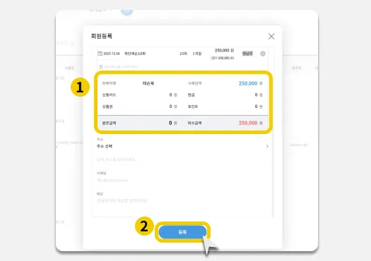 회원등록 시에, 구매금액 입력을 하지 않고 등록을 하면, 미수금 등록을 할 수 있습니다.