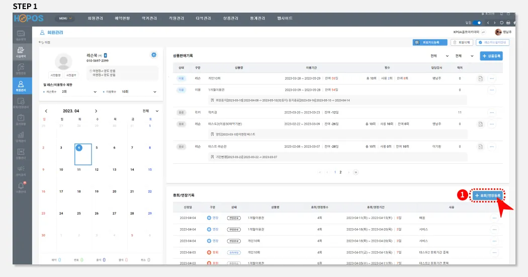 회원관리 > 회원상세 페이지에서 휴회/연장을 등록할 수 있습니다.
