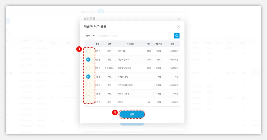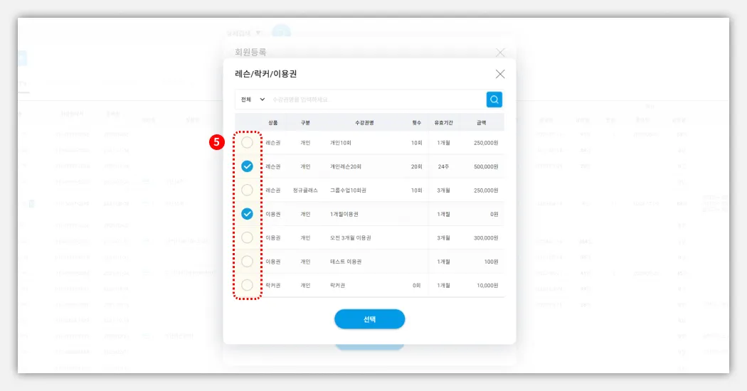 상품등록 팝업에서, 등록할 상품을 선택합니다. (복수선택 가능, 레슨권 선택 후 강사 지정페이지로 이동)
