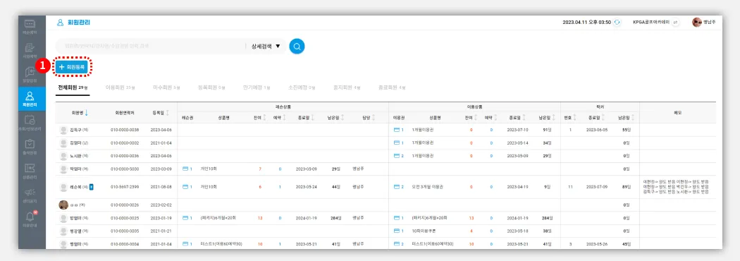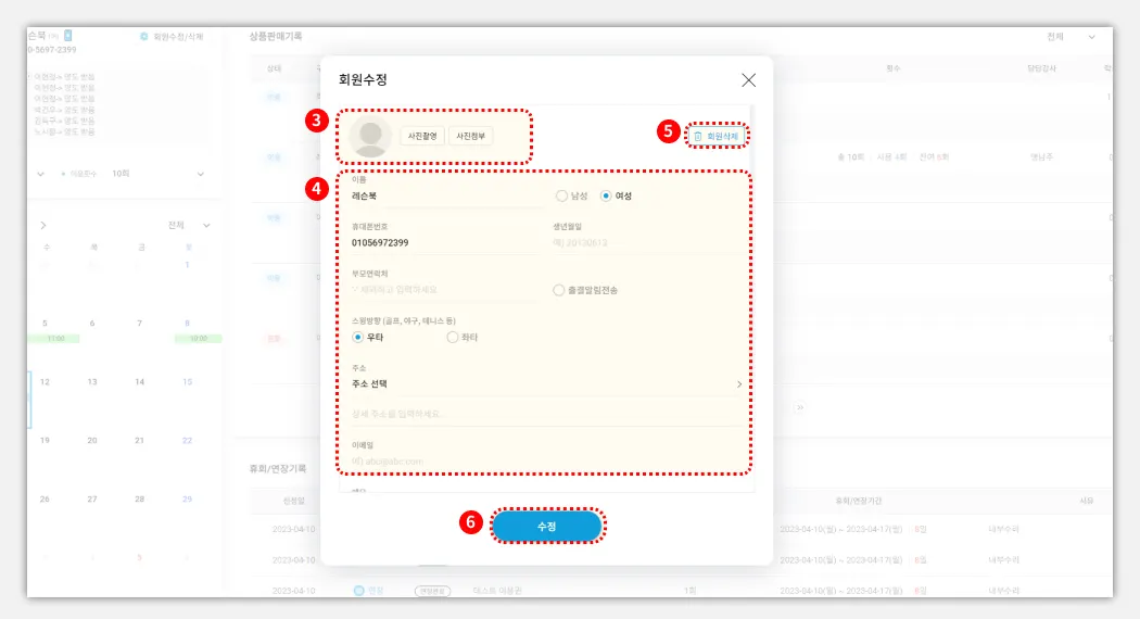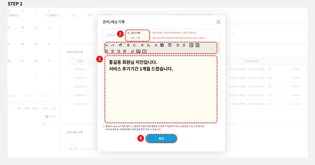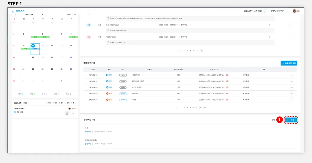 회원상세 페이지에서, 회원의 관리기록이나 레슨기록을 등록할 수 있습니다.
