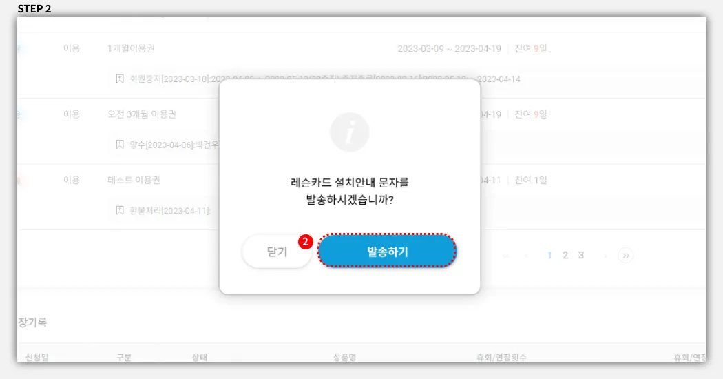 회원상세 페이지에서, 우측상단에 ‘레슨카드 설치 문자발송’을 선택합니다.