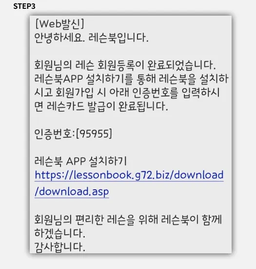 회원에게 레슨북 어플 회원가입에 필요한 인증번호와 설치URL이 포함된 문자메세지가 발송됩니다.