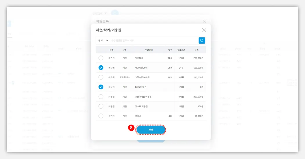 강사지정이 완료되면, 상품등록 팝업으로 돌아옵니다. 등록할 레슨권과 이용권 지정 후에, ‘선택’버튼을 눌러, 상품등록을 완료하고 매출등록 팝업을 호출합니다.