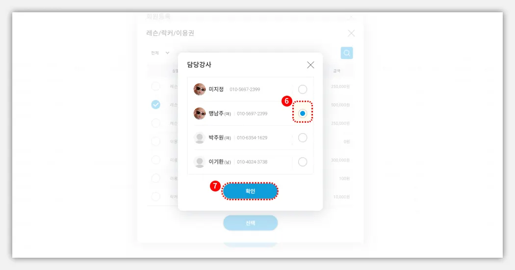 레슨권을 선택하면, 담당강사 선택팝업이 뜨고, 팝업창에서 담당강사를 지정해주세요