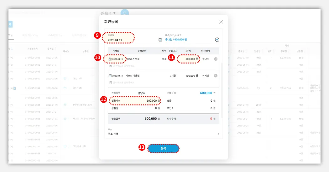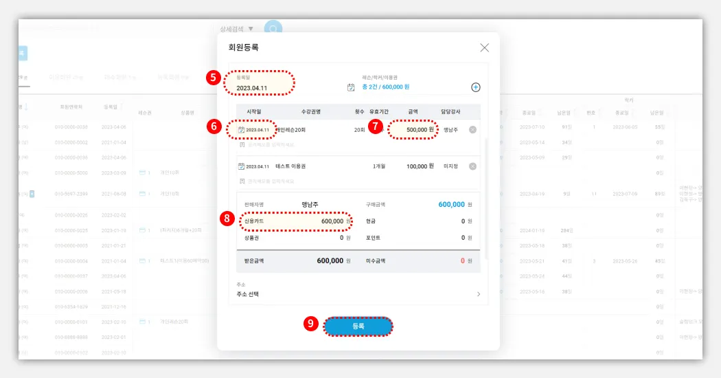 등록 버튼을 눌러, 미수금을 잡은 채로, 회원등록을 완료합니다.