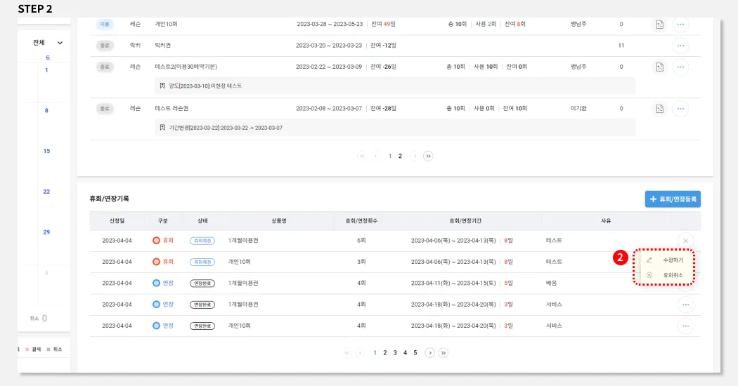 회원상세 페이지에서, 휴회/연장등록 버튼을 선택해, 휴회/연장등록 팝업창을 호출합니다.