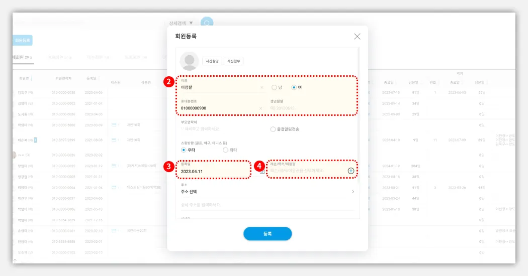 회원등록 팝업창에서, 회원명과 휴대폰번호를 입력합니다. (휴대폰번호가 없으면, 비워둡니다. 자녀회원일 경우에는, 부모연락처란에 부모님 휴대폰 번호를 입력합니다. 부모님 휴대폰에서 레슨카드를 볼 수 있습니다.)