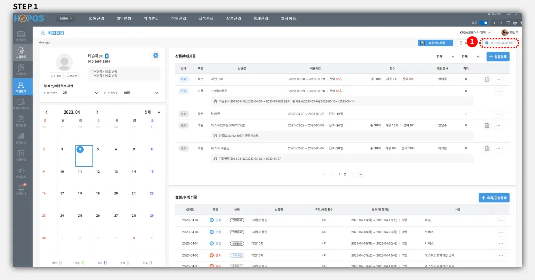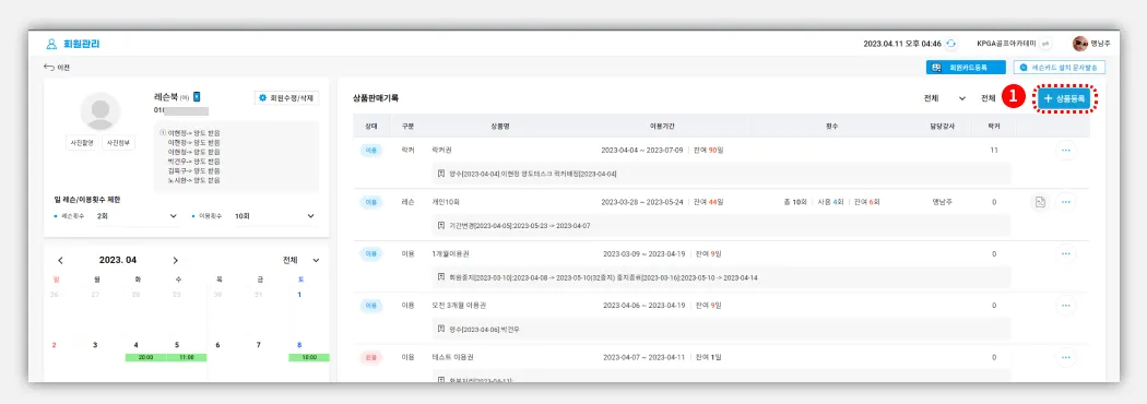 기존회원에 레슨권/이용권/락커권을 등록할 수 있습니다.