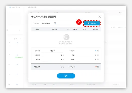 레슨/락커/이용권을 선택해, 상품등록 팝업을 호출합니다.