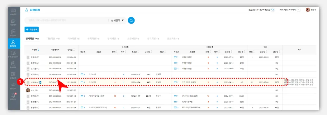 회원관리 메인 화면에서, 수정을 원하는 회원을 선택합니다.