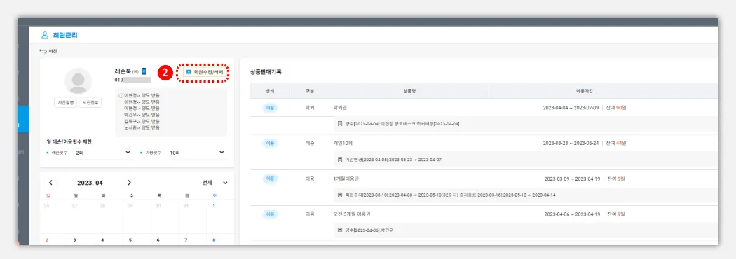 회원상세 페이지에서, 회원이 가지고 있는 상품목록을 확인합니다. 수정이 필요한 레슨권의 수정버튼을 누르시면, 수정할 수 있는 내용이 팝업창으로 호출됩니다.