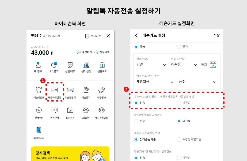 ‘레슨카드설정 화면’에서 ‘예약/취소/변경/완료 시 회원에게 알림톡 자동전송 설정’을 ‘전송’으로 설정합니다.