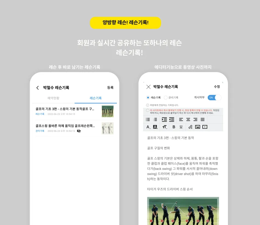 그날그날 어떤 레슨을 했는지, 회원과 공유하고 프로님이 찍어주신 사진이나 동영상과 함께 간단한 텍스트로 레슨기록을 회원님들께 남겨줘 보세요. 레슨에 대한 만족도는 올라가고, 레슨 재등록으로 이어질 수 있는 선순환의 마법!