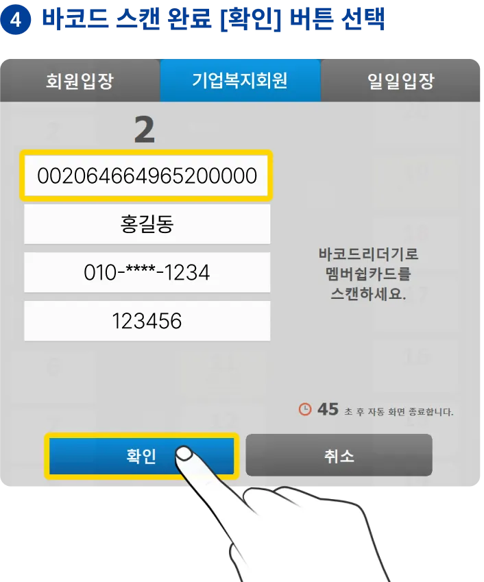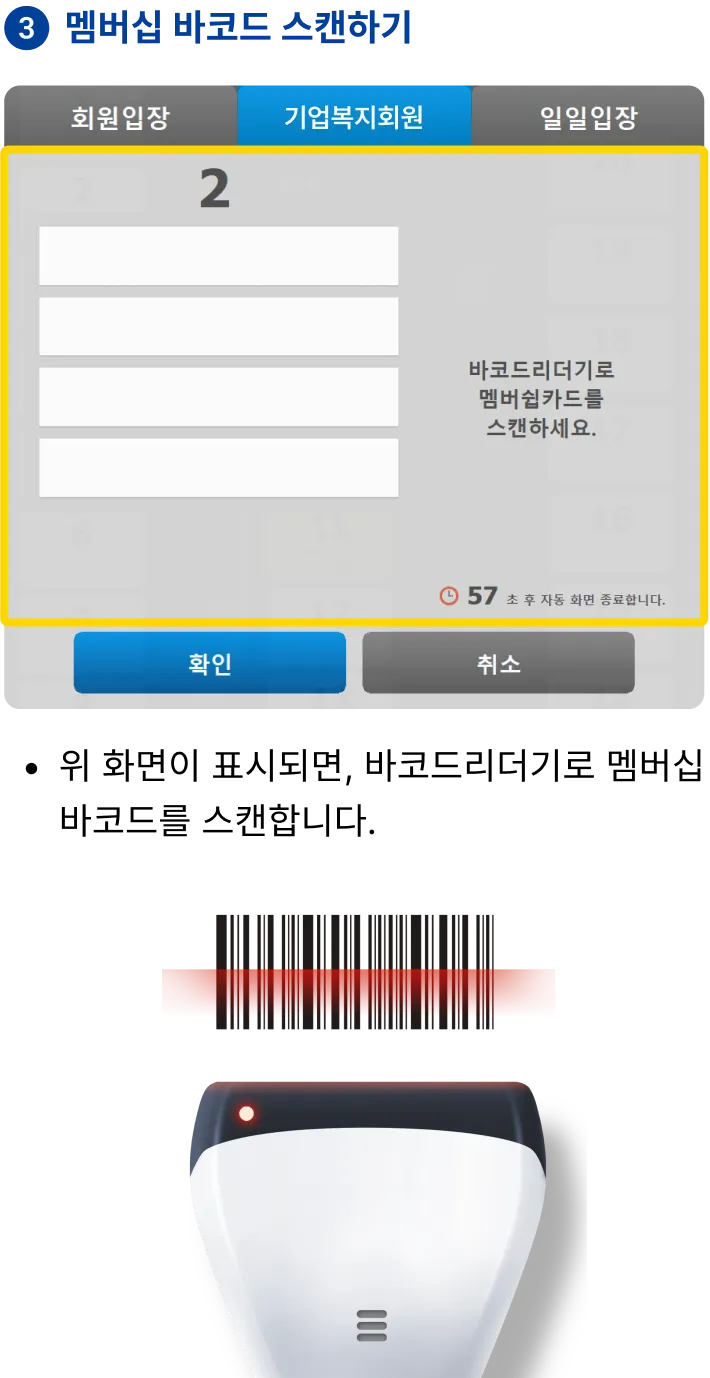 ‘기업복지회원’ 확인창에서, 바코드 리더기에 기업복지몰 바코드를 스캔하세요