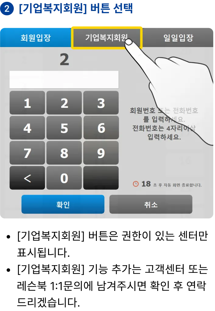 기업복지몰(웰빙클럽,아이코젠 등) 회원정보 연동을 위해, 먼저 기업복지몰(웰빙클럽,아이코젠 등)에 문의하셔서, ‘시설코드’ ‘ API토큰’를 요청해 레슨북쪽으로 연동신청해주시면 이용하실 수 있도록 프로그램 변경 해드립니다. (바코드 스캐너 구입 필수 - USB타입 바코드 스캐너를 직접 인터넷이나 오프라인 매장에서 구매하시면 됩니다.)