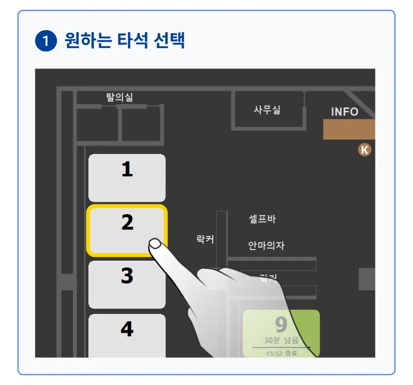 기업복지몰 어플에서 발행하는 바코드를 키오스크에서 타석선택 후, 바코드스캐너에 판독시켜 승인이 나면 타석배정이 이루어 집니다.