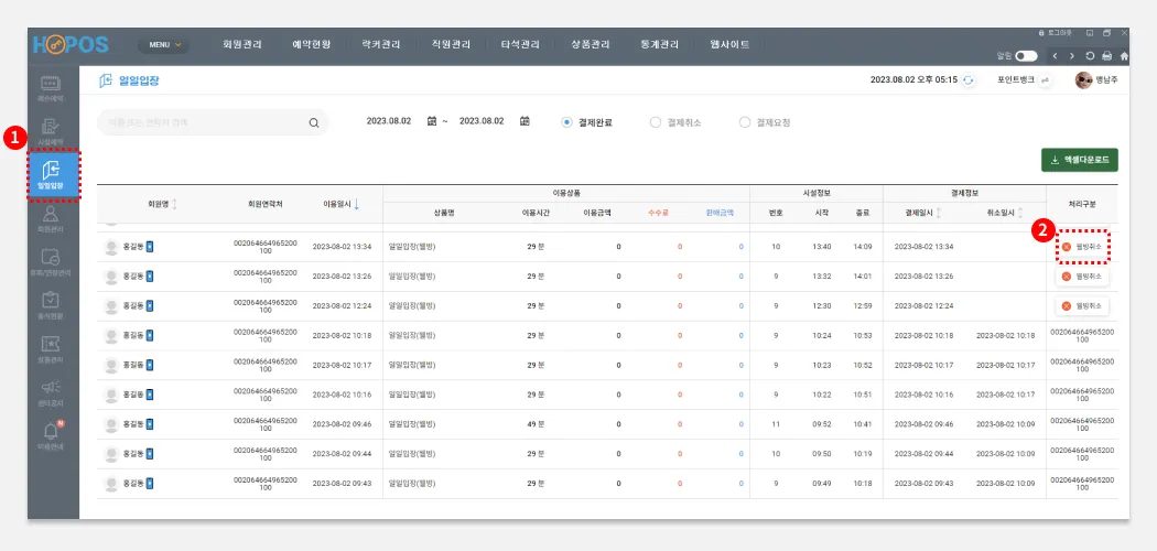 HPOS Web메뉴(좌측메뉴)의 ‘일일입장’을 선택합니다. (일일입장에서, 게스트, 일일상품 구매 입장, 웰빙클럽 입장 내역을 확인합니다)