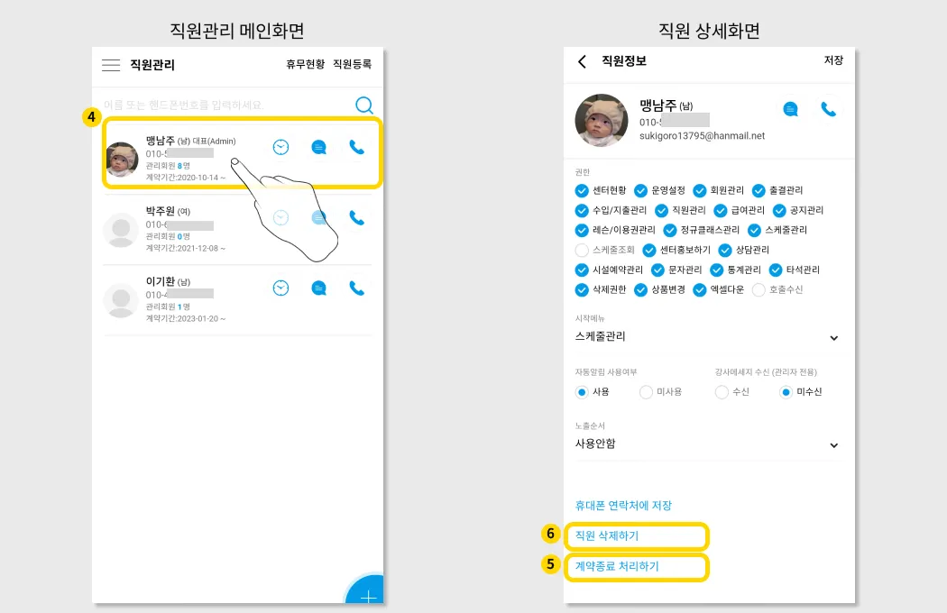 (계약종료 처리가 되면, 센터관리 메뉴에 접근할 수 없습니다. 수당처리 등 처리할 문제가 다 처리되면 아래 ‘6’으로 직원 삭제처리 하시면 됩니다)