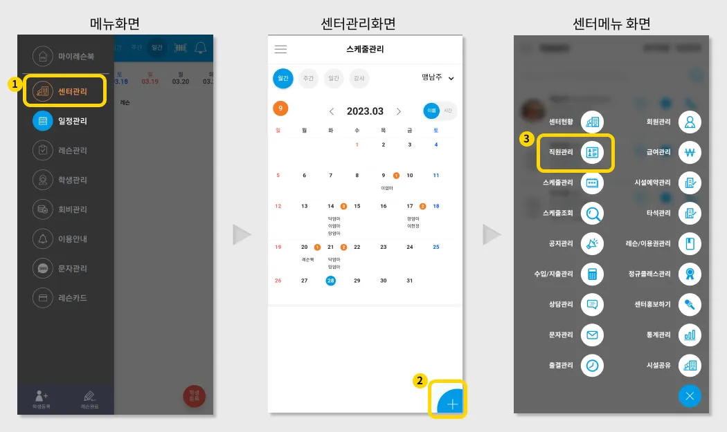 센터메뉴 화면에서 ‘직원관리’를 선택합니다.