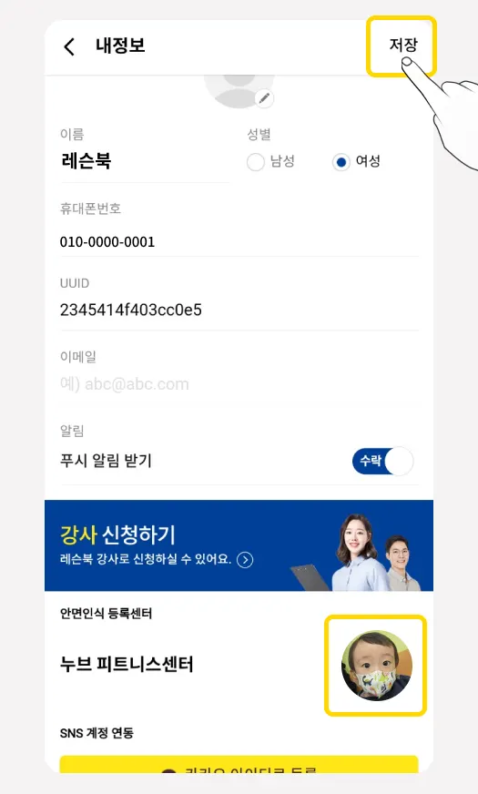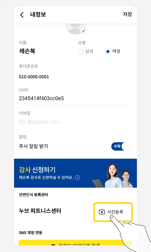 안면인식기로 출입하는 센터를 이용중입니다. 레슨북 어플에 사진등록을 어떻게 하면 되나요?