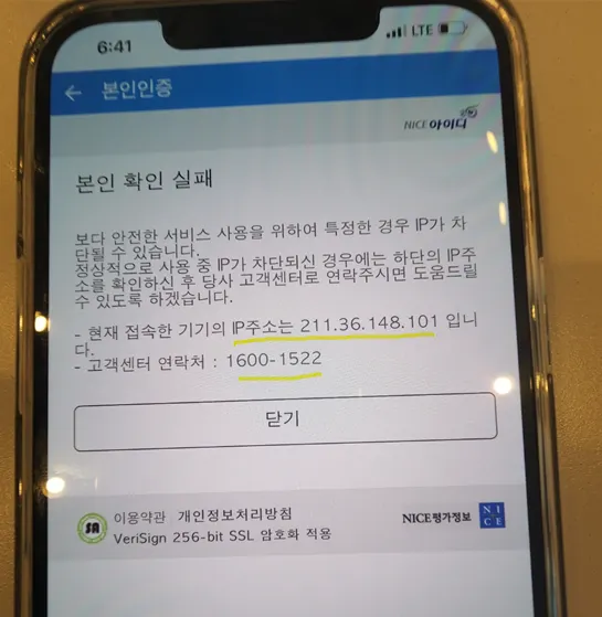 IP 차단 오류 발생 시, 화면상의 안내와 같이 NICE고객센터 1600-1522로 연락하여