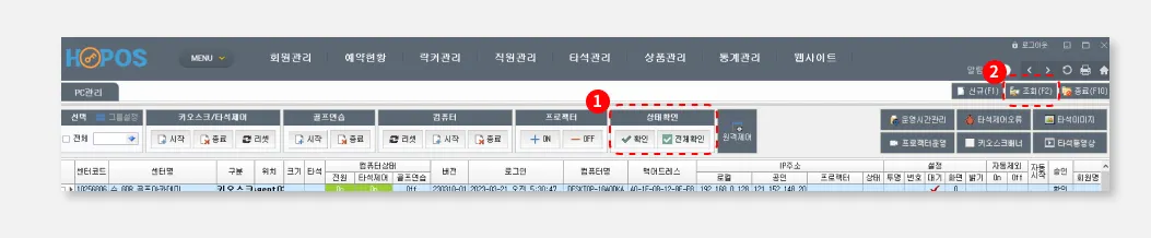 HPOS의 PC관리에 표시하는 ON/OFF표시는 몇 분 전의 서버의 정보를 표시하기 때문에리얼타임의 상태표시는 아닙니다. 그래서 실제 타석은 켜져 있는데 off로 표시가 된다거나, 꺼져 있는데 on으로 표시된다거나 할 수 있습니다. 현재의 타석의 상태를 확인하고자 할때는 ‘상태확인’ 버튼을 눌러서 각 타석의 상태를 확인합니다.