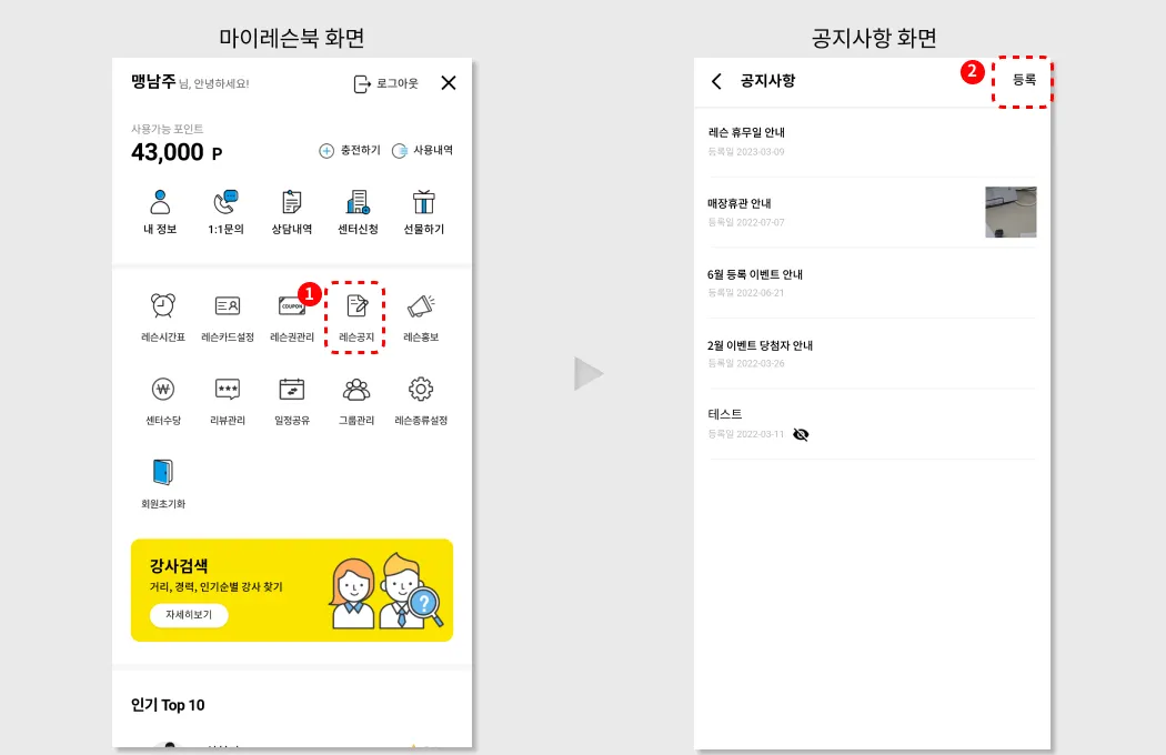 메뉴 > 마이레슨북 > 공지관리 (공지를 등록하면, 회원이 어플실행 시, 등록된 공지가 팝업으로 표시되요)