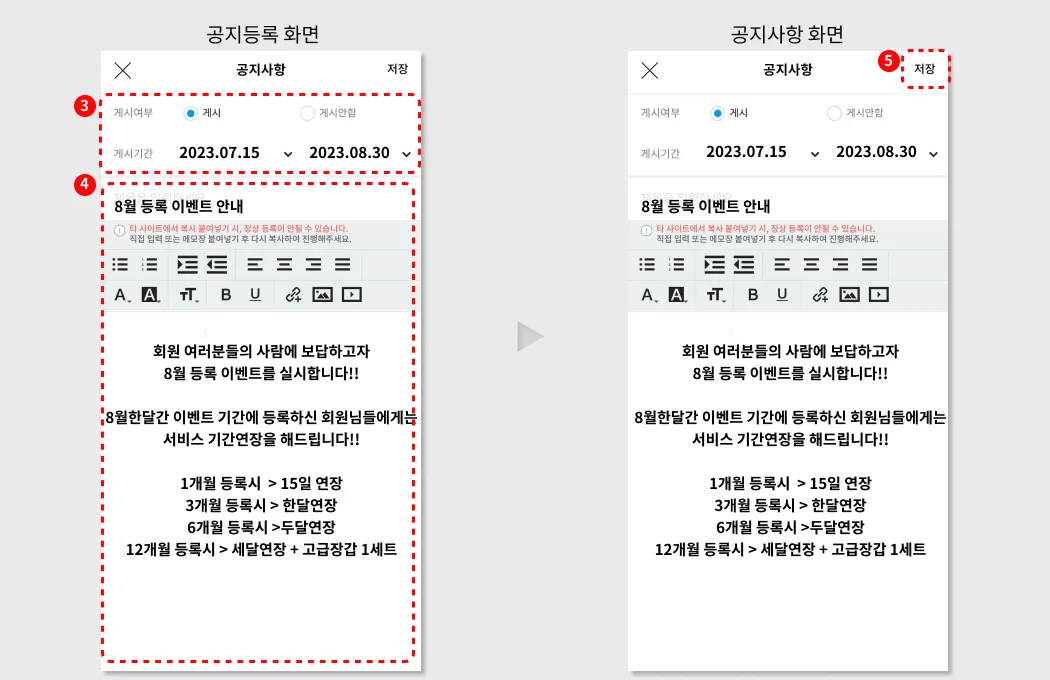 내용을 확인하시고, 저장을 눌러 공지등록을 완료하세요