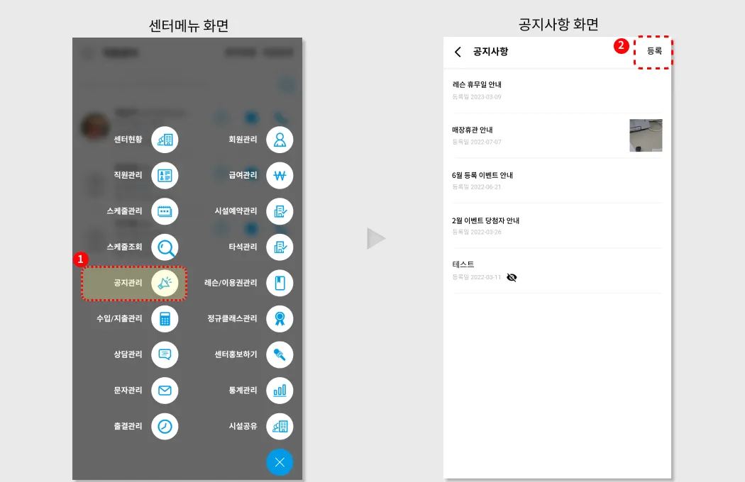 메뉴 > 센터관리 > 센터메뉴 > 공지관리 (공지를 등록하면, 회원이 어플실행 시, 등록된 공지가 팝업으로 표시되요)