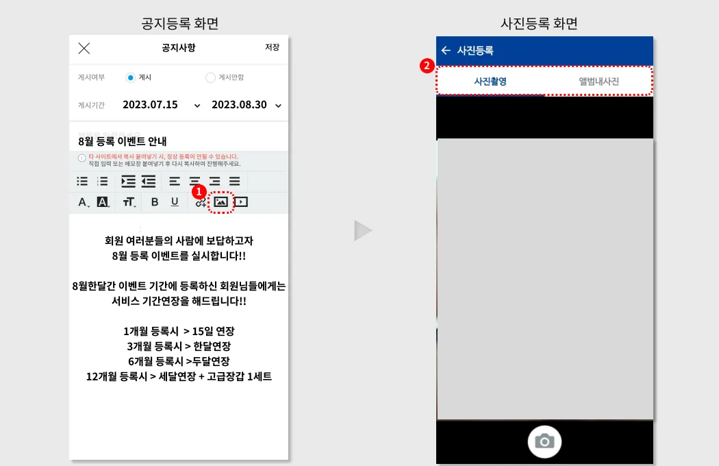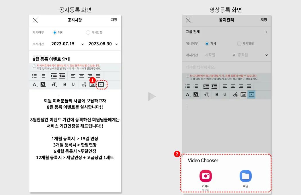 공지 등록 시, 공지에 사진이나 영상을 바로 등록할 수 있습니다.