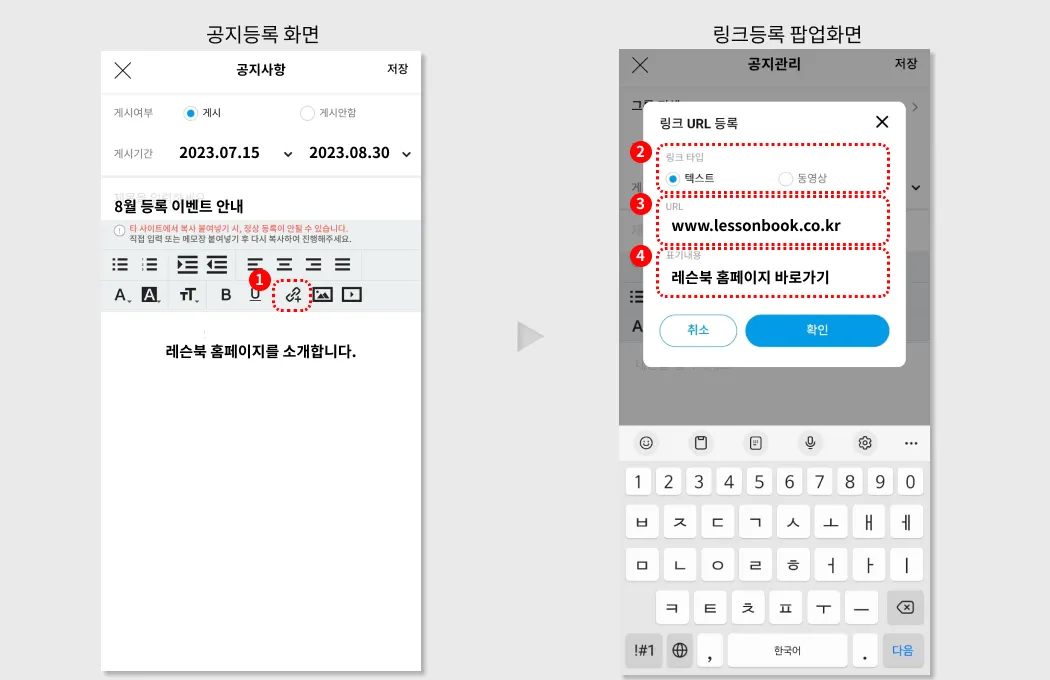 공지등록화면 에디터에서, 링크걸기 버튼을 선택해 링크등록 팝업화면을 호출합니다.