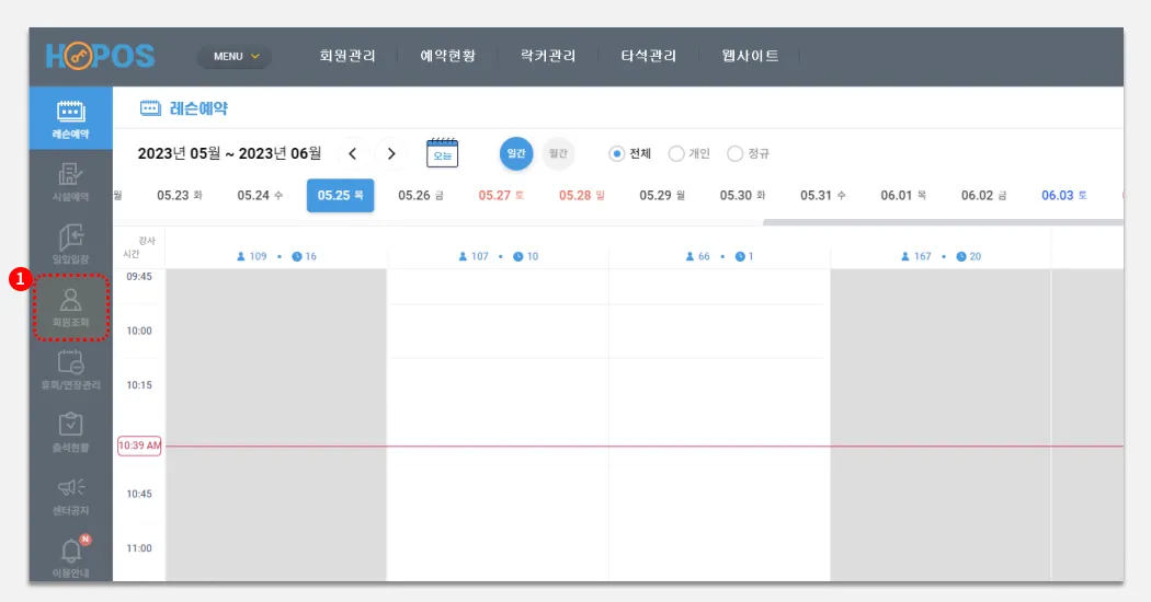 어플리케이션 직원관리에서, 회원관리 권한을 빼면, HPOS에 로그인 한 직원에게는 ‘회원관리’가 아닌 ‘회원조회’메뉴가 표시됩니다. (사용자등록요청 필수 - 레슨북에 요청해주세요) HPOS 로그인 시, 사용자명에 사용자등록이 된 직원이름과 비밀번호로 로그인을 하면, 센터장이 어플 직원관리에서 회원관리 권한이 있는 직원은 ‘회원관리’메뉴가 표시되고, 회원관리 권한이 없는 직원에게는 ‘회원조회’메뉴가 표시되어, 회원등록과 상품등록만 할 수 있게 됩니다.
