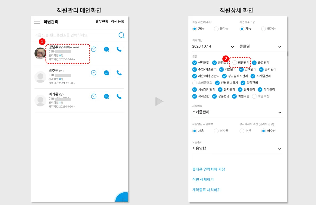 직원상세 페이지 ‘권한’ 부분에서, 회원관리 권한의 체크해제 합니다. 체크해제하시면 권한이 제한됩니다.