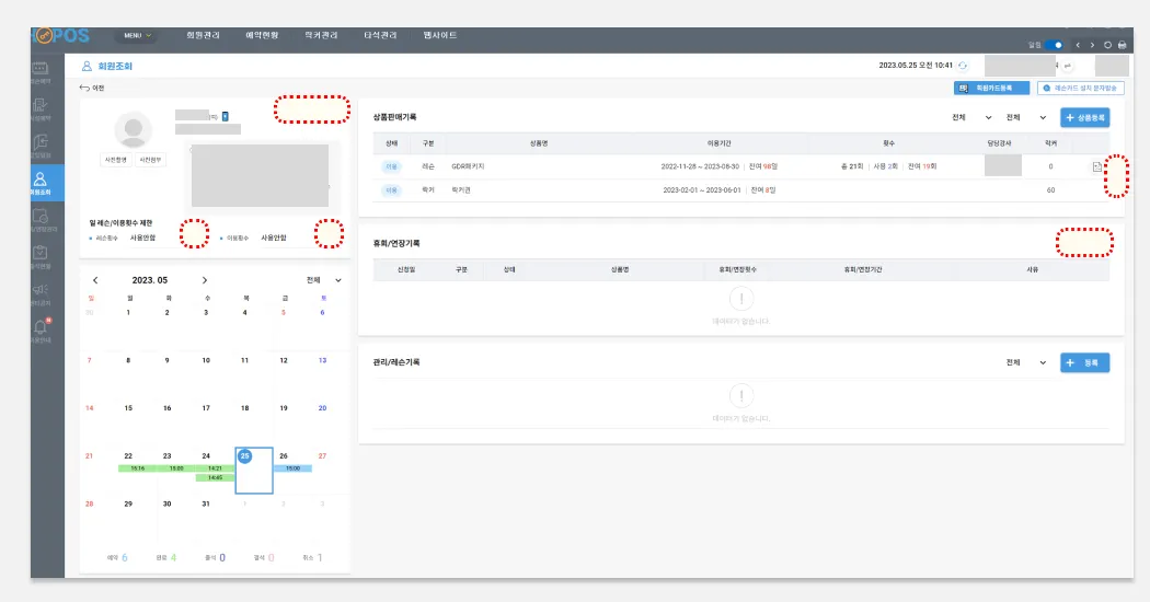 빨간 점선 부분에 위치한, 수정버튼들이 전부 사라지고, 조회만 할 수 있게 됩니다. 단, 신규회원등록과 상품등록은 가능합니다.