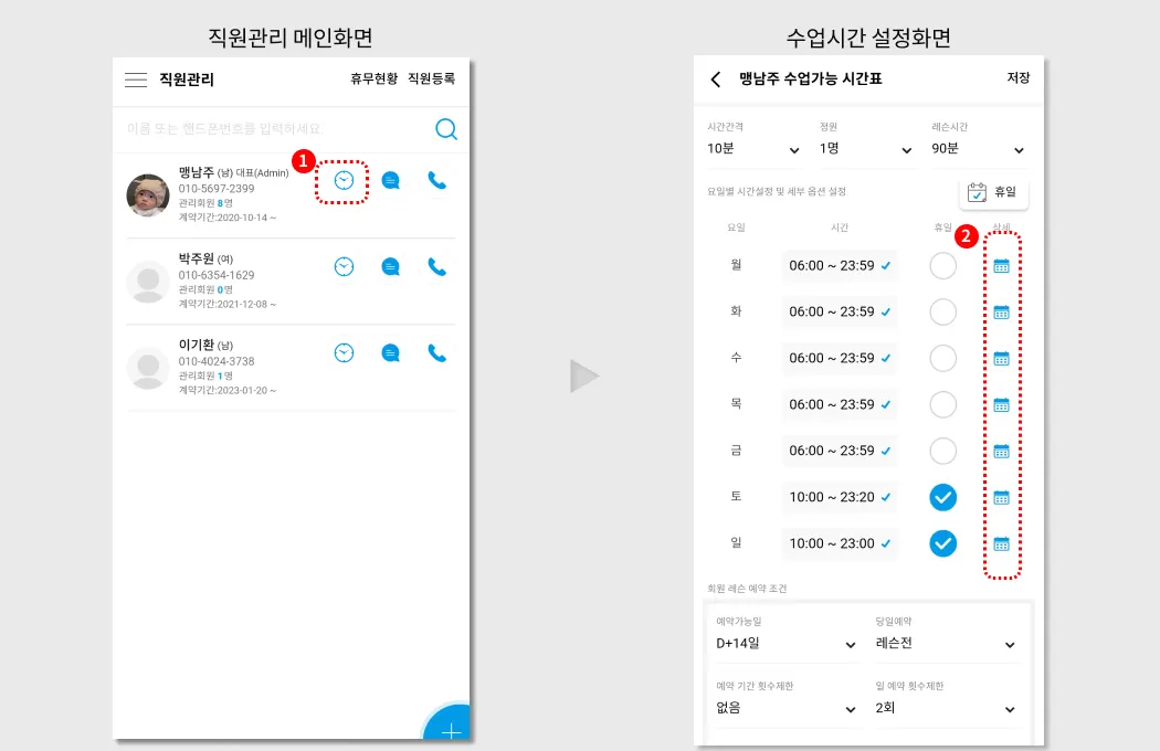 직원관리 메인화면에서, ‘시계아이콘’을 선택합니다. (직원의 상세페이지에서 수업시간을 선택해도 됩니다)