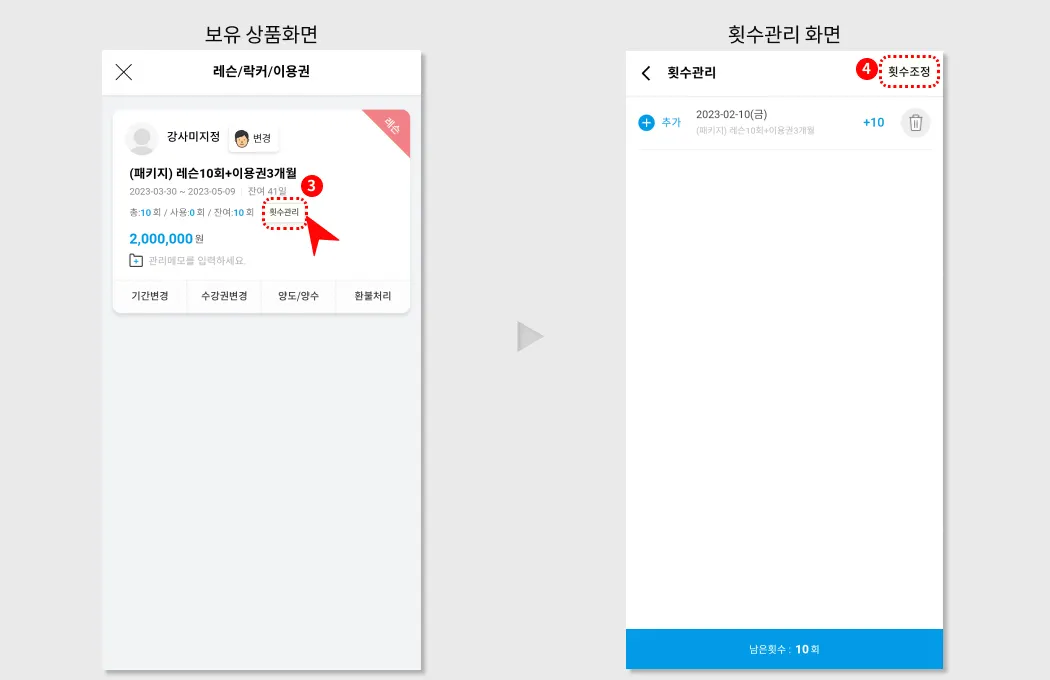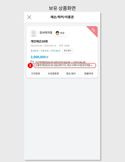 보유 상품목록에서, 레슨권의 ‘횟수관리’를 선택합니다.