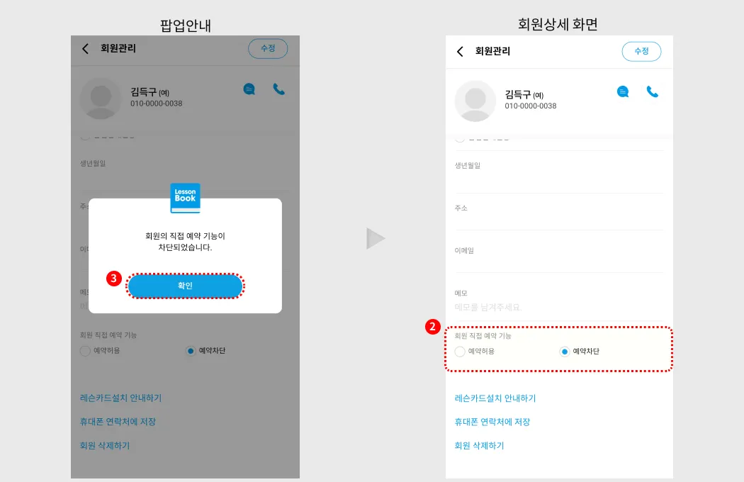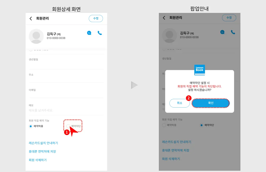회원상세 페이지에서, 아래쪽, 회원직접 예약가능 옵션에서, ‘예약차단’을 선택합니다.