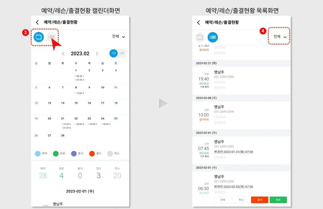 우측상단에 상태버튼을 선택해, ‘전체,예약,완료,취소,결석,출석’의 상태별로 표시도 할 수 있습니다.
