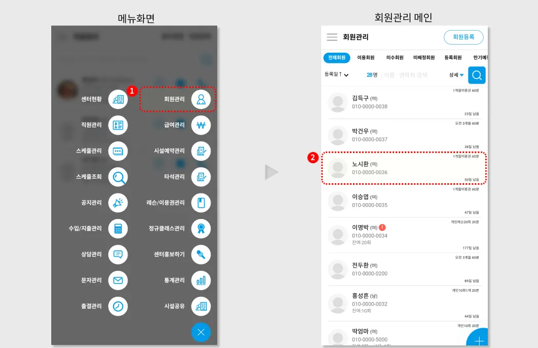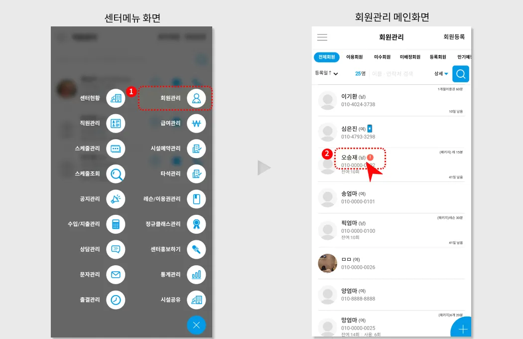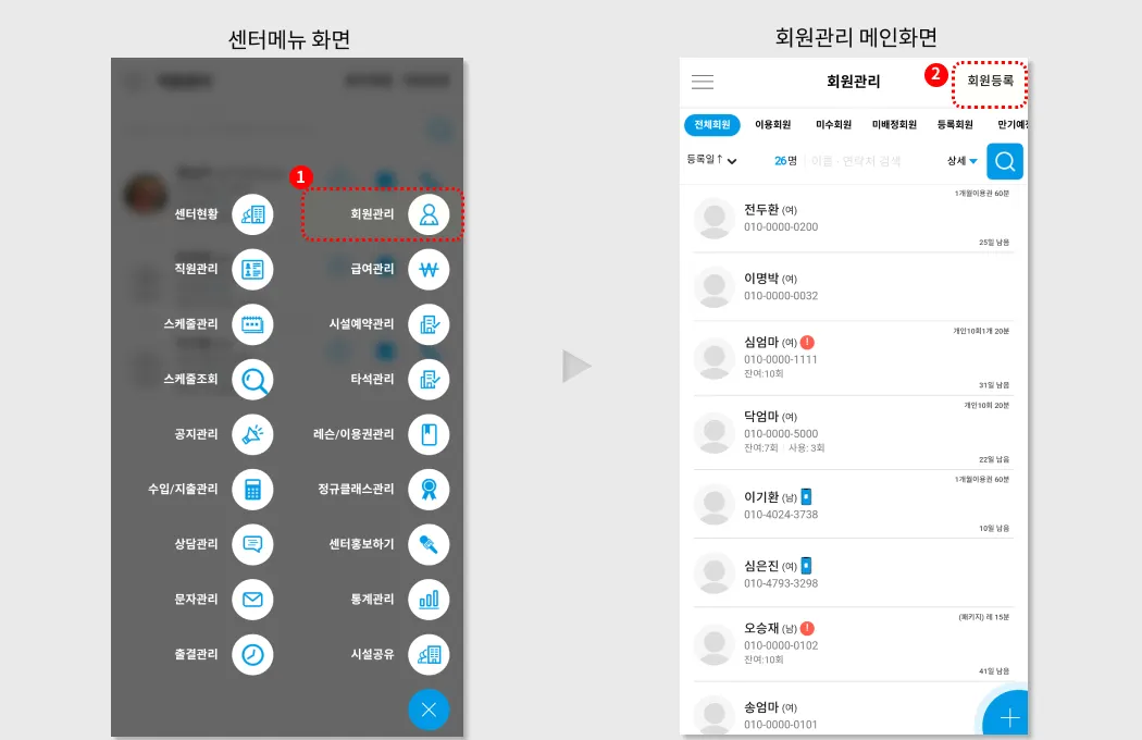 센터메뉴 화면에서, ‘회원관리’를 선택합니다.