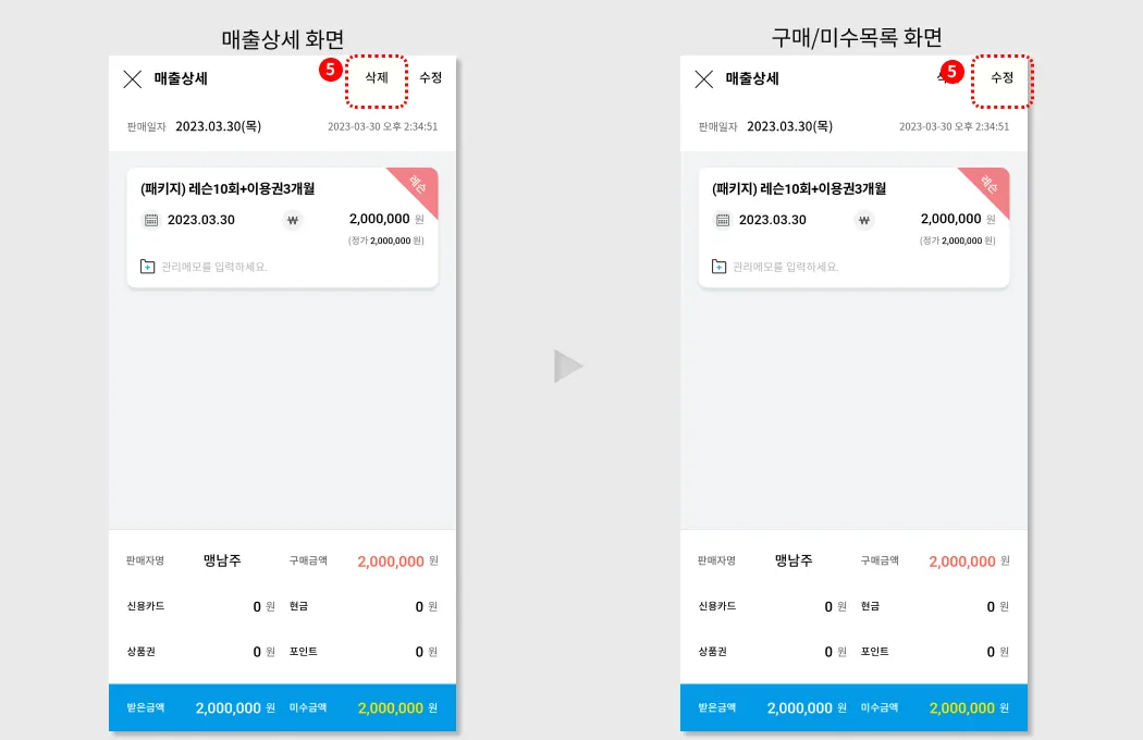 회원등록을 잘못했거나, 잘못해서 미수등록을 하게 되었을 때, 매출정보를 수정합니다.