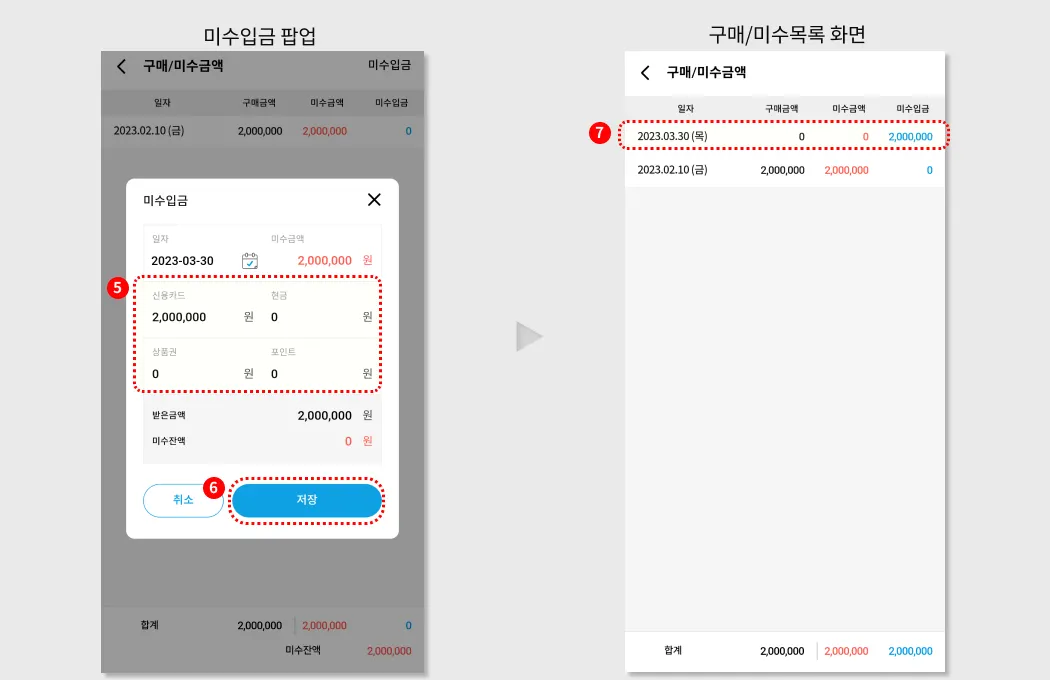전체 구매금액의 결제방법에 따라 받은 금액을 입력해, 미수금액을 0으로 만듭니다. (받은금액을 등록하지 않으면, 미수회원으로 분류됩니다. 저장을 하셨다면, 수정처리(참고: ✅ 3. 등록 매출정보 수정/삭제하기)를 합니다.)