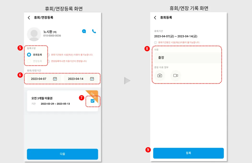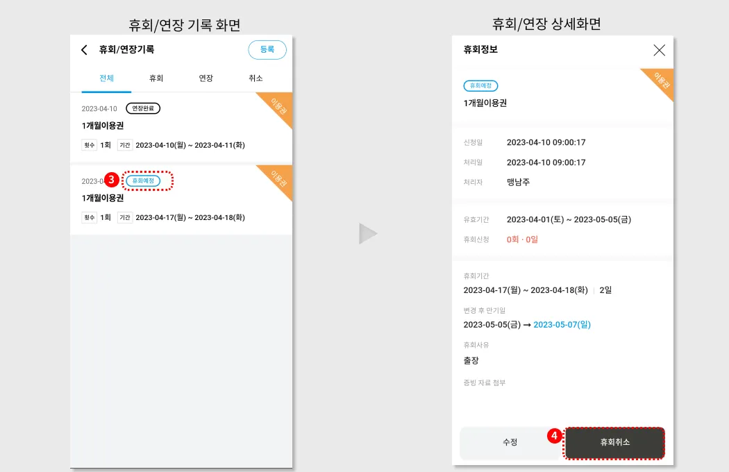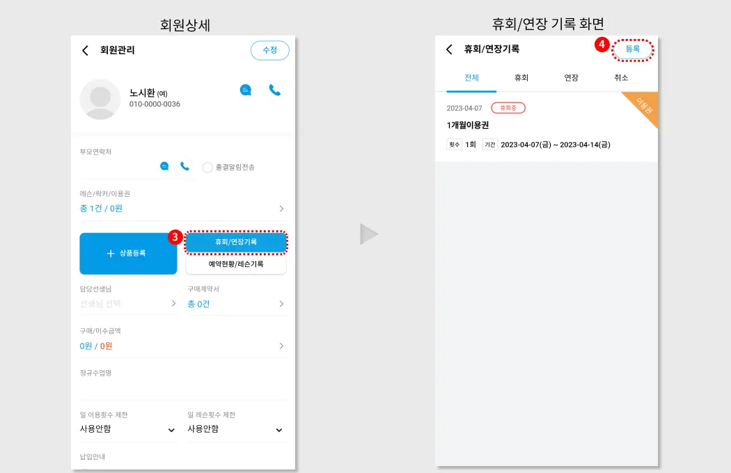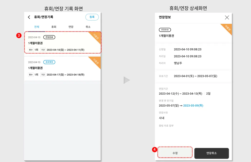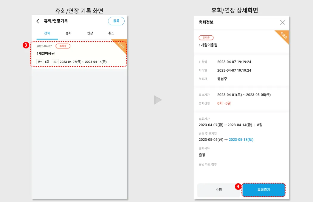회원상세 화면에서, 휴회/연장기록을 선택합니다. (휴회/연장 기록이 있으면, 배지로 건수가 표시됩니다)