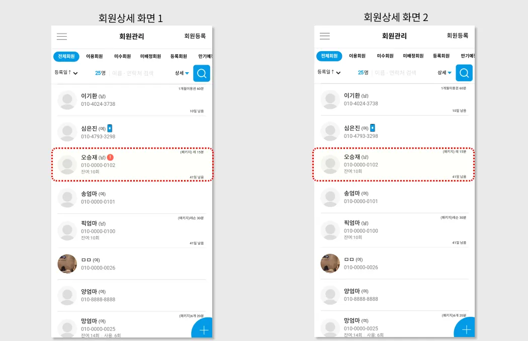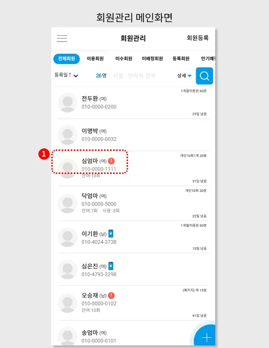 미수금이 있는 회원은, 회원관리 메인화면에서, 붉은색 느낌표로 구분할 수 있습니다.