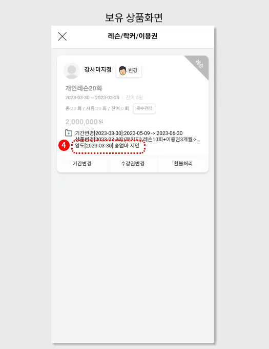양도한 회원의 보유상품 화면에서, 수강권이 미활성화되었는지 확인하고, 관리메모에 양도기록을 확인합니다.