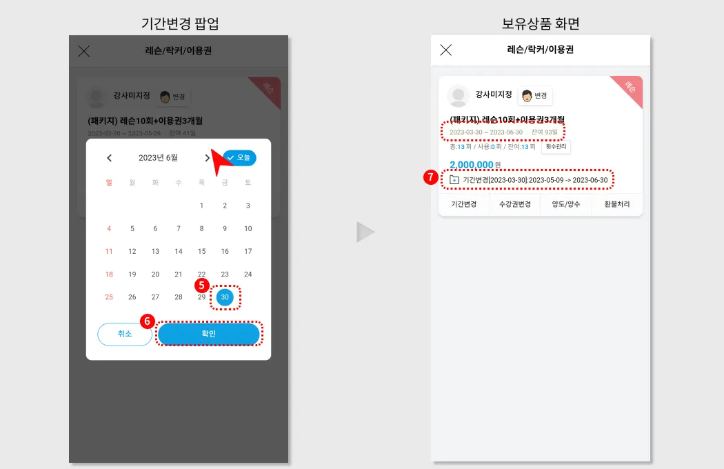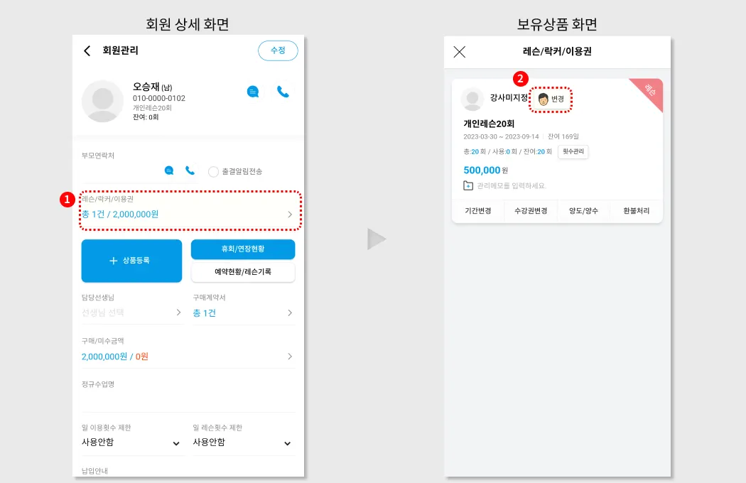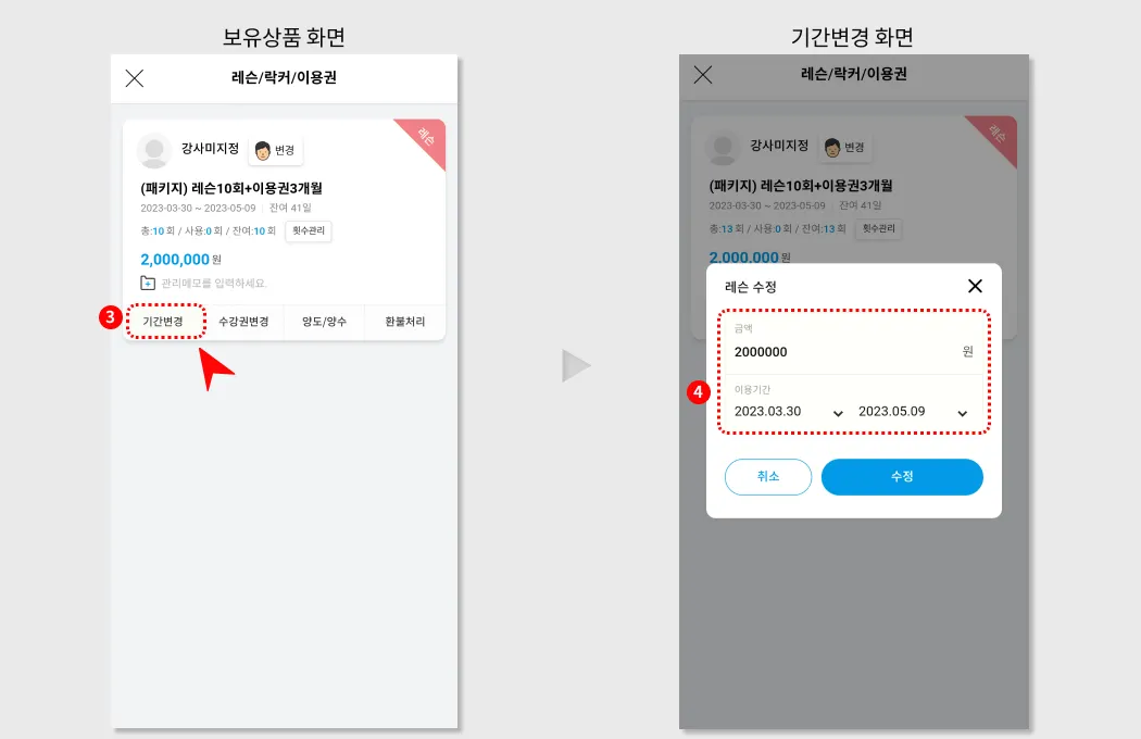 회원이 보유한 레슨권이나 이용권의 유효기간/금액을 변경할 수 있습니다.