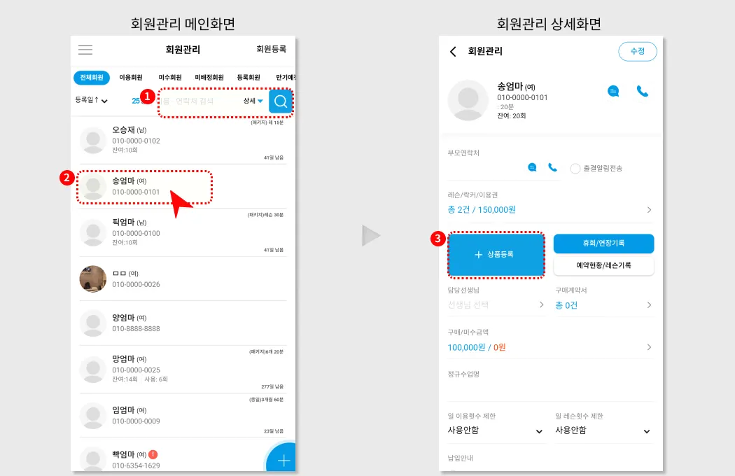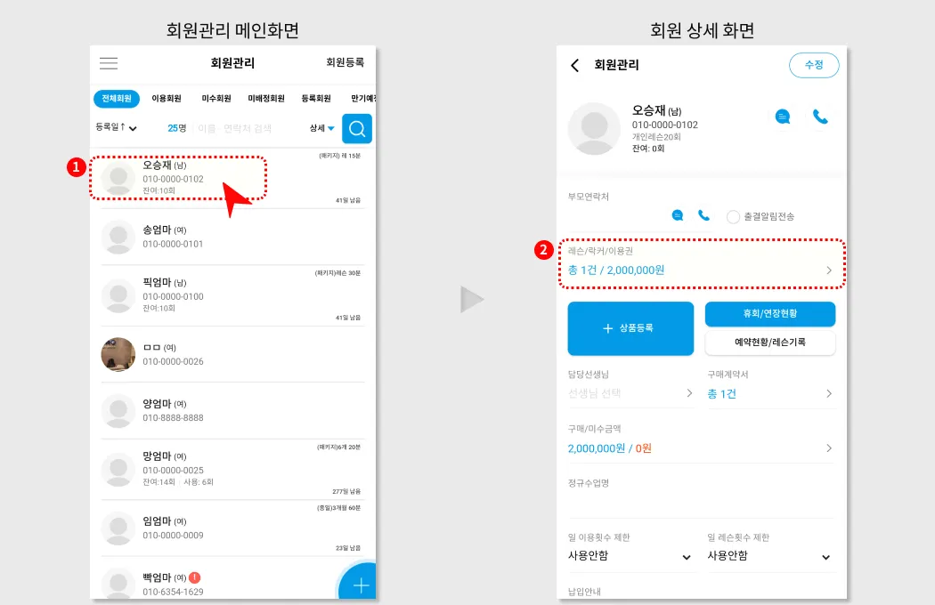 (메뉴 > 회원관리 > 회원상세 > 레슨/이용/락커권 )