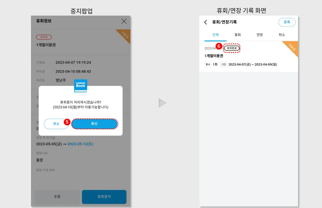 휴회중지 팝업에서 확인을 눌러, 중지를 완료합니다.